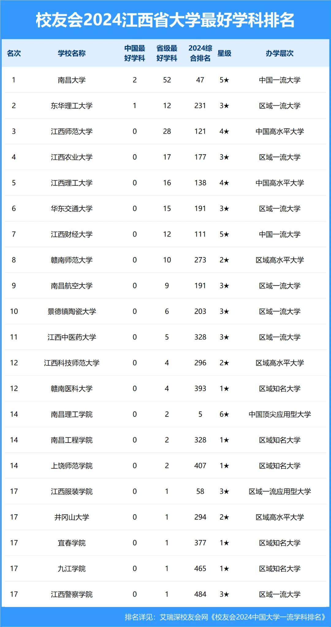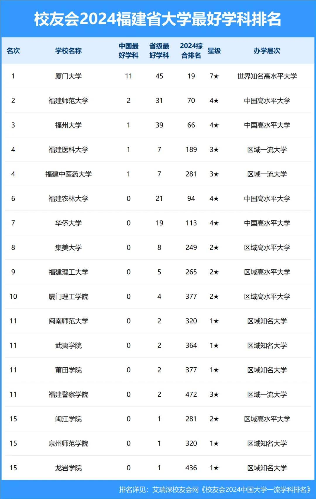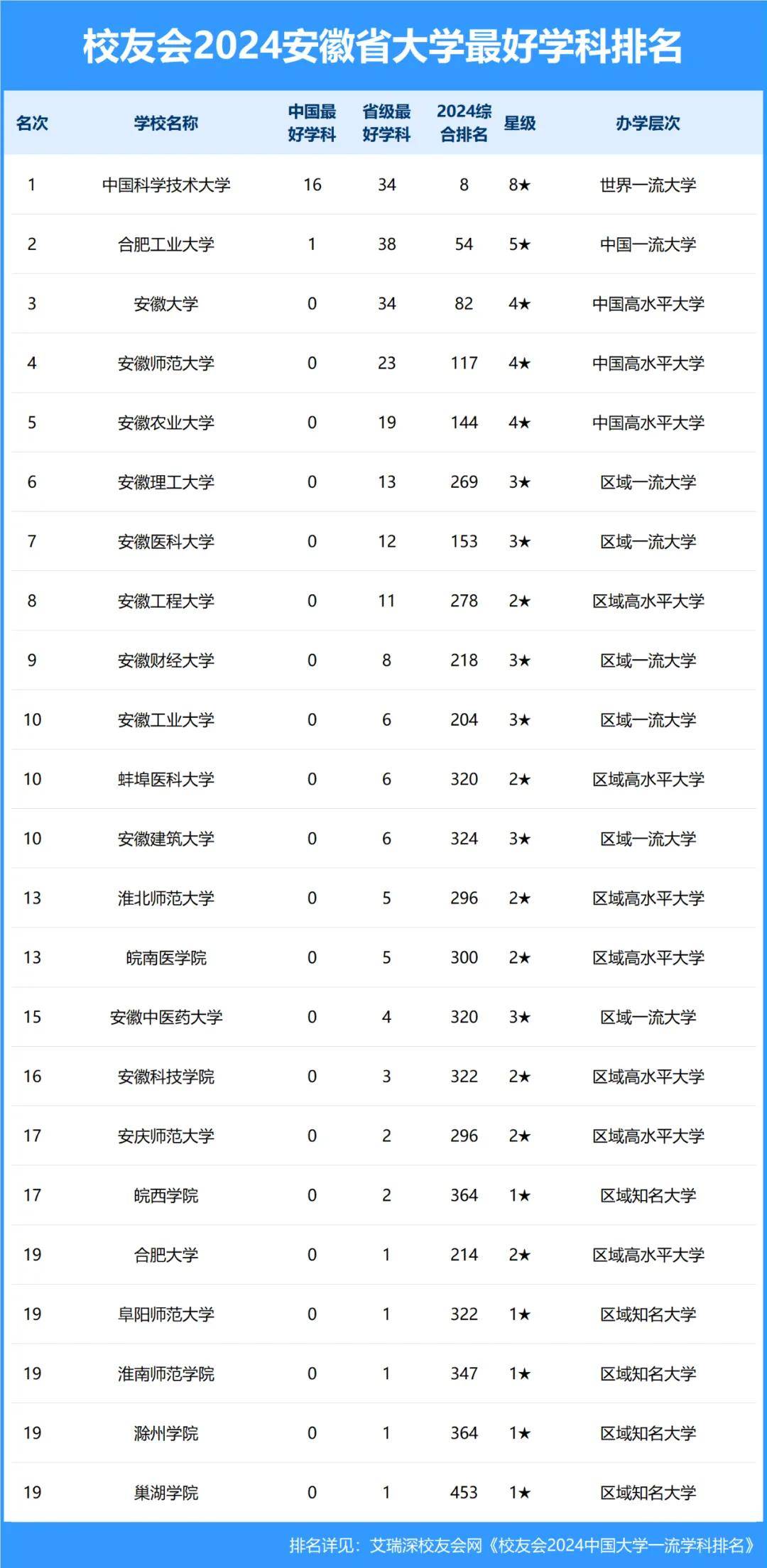 |     备受关注的2025年全国硕士研究生考试报名工作即将启动,2024年9月24日,全国第三方大学评价机构艾瑞深校友会网(Cuaa.Net)最新发布校友会2024中国大学最好学科排名、2024中国华东地区大学最好学科排名,旨在为2025全国各地考研考生填报志愿提供权威参考指南, 榜单显示,根据艾瑞深校友会2024中国最好学科遴选标准,全国共有197所高校的823个学科入选2024中国最好学科。北京大学、清华大学各45个学科入选2024中国最好学科名单,学科水平最高,雄居校友会2024中国大学最好学科排名冠军。浙江大学第三,复旦大学第四,南京大学第五,上海交通大学第六,中山大学第七,南开大学和四川大学并列第八,武汉大学和北京师范大学并列第十。 在全国非双一流高校中,扬州大学、武汉科技大学、东北财经大学、山东农业大学和南京艺术学院各拥有3个中国最好学科,位居全国非“双一流”高校首位,学科建设水平最好。燕山大学、首都医科大学、河北大学、福建师范大学、浙江工业大学、哈尔滨医科大学、中南林业科技大学、黑龙江中医药大学、中国刑事警察学院、甘肃政法大学和中国人民警察大学等大学各有2个学科数上榜。 校友会中国大学一流学科排名首发于2014年,旨在给全国考研考生填报志愿、中国大学“双一流”建设提供权威参考。 校友会中国大学一流学科排名坚持正确的教育评价导向与价值取向,坚决贯彻落实立德树人根本任务,聚焦中国高校“双一流”建设重点任务,围绕“大平台、大团队、大项目、大成果、大校友”建设目标,引导中国大学扎根中国大地办教育,推进中国大学深化实施有组织的科研,解决卡脖子问题,提高服务国家地方经济社会发展的能力与贡献,助力中国大学加快“双一流”学科和省级高水平学科建设,增强学科核心竞争力与学科建设水平。 校友会2024中国大学一流学科排名评价体系由思政教育、教学质量、杰出校友、高层次人才、科研平台、科研成果、科研项目与社会服务等八大一级指标组成,以艾瑞深“大学360度全景数据平台”为数据支持,围绕着“大平台、大团队、大项目、大成果、大校友”评价体系框架对中国大学学科发展水平展开系统评价,涵盖200多项体现中国大学学科建设水平的核心评测指标,指标数据全部来源于教育部、科技部、人事部、第三方机构和高校等对社会公开的权威数据与客观数据。     校友会中国大学一流学科排名评价按照分类、分级和分层评价原则,采用定量和定性相结合的评价方法,依据学科的综合得分对中国高校一级学科的综合实力、学科水平与办学质量进行评价,即用星(★)的数量表示学科的办学等级、办学水平与办学层次,从高到低分为10个星级,即:10★(世界顶尖学科)、9★(世界知名一流学科)、8★(世界一流学科)、7★(世界知名高水平学科)、6★(世界高水平学科、中国顶尖学科)、5★(中国一流学科)、4★(中国高水平学科)、3★(区域一流学科)、2★(区域高水平学科)和1★(区域知名学科)。     校友会2024中国最好学科遴选标准 为了便于全国高考和考研考生全面系统比较分析中国大学的学科建设水平,艾瑞深中国大学评价课题组依据校友会2024中国大学一流学科排名上榜学科的星级排名、位次百分比和位次区间等提出校友会2024中国最好学科和2024中国各地区最好学科遴选标准。 校友会2024中国最好学科遴选标准:1)全国排名前5%学科;2)全国排名前5名学科;3)中国八星级学科(8★)、中国七星级学科(7★)和中国六星级学科(6★)。 校友会2024中国各地区最好学科(即省级最好学科)遴选标准:1)中国最好学科入选学科;2)全国各地区排名前3名学科;3)中国五星级学科(5★)和中国四星级学科(4★)。 校友会2024中国华东地区大学最好学科排名 校友会2024福建省大学最好学科排名,厦门大学第一 在最新校友会2024中国大学最好学科排名和2024福建省大学最好学科排名中,福建省共有厦门大学、福建师范大学等5所高校的16个学科跻身2024中国最好学科名单。福州大学、福建医科大学、福建中医药大学等17所高校的197个学科上榜校友会2024福建省最好学科排名。 厦门大学有11个中国最好学科和45个福建省最好学科,雄居校友会2024福建省大学最好学科排名第一,福建师范大学有2个中国最好学科和31个福建省最好学科,位列第二。福州大学有1个中国最好学科和39个福建省最好学科,位居第三。福建医科大学、福建中医药大学并列第四,福建农林大学第六,华侨大学第七,集美大学第八,福建理工大学第九,厦门理工学院第十。 点击查看:校友会2024福建省大学最好学科排名     校友会2024安徽省大学最好学科排名,中国科学技术大学第一 在最新校友会2024中国大学最好学科排名和2024安徽省大学最好学科排名中,安徽省共有中国科学技术大学、合肥工业大学等2所高校的17个学科跻身2024中国最好学科名单,安徽大学、安徽师范大学等23所高校的236个学科上榜2024安徽省最好学科排名。 中国科学技术大学有16个中国最好学科和34个安徽省最好学科,雄居校友会2024安徽省大学最好学科排名第一,合肥工业大学有1个中国最好学科和38个安徽省最好学科,位列第二。安徽大学有34个安徽省最好学科,位居第三。安徽师范大学第四,安徽农业大学第五,安徽理工大学第六,安徽医科大学第七,安徽工程大学第八,安徽财经大学第九,安徽工业大学、